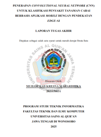 XMLTanaman cabai (Capsicum sp.) merupakan salah satu komoditas penting diIndonesia, namun rentan terhadap berbagai penyakit yang menyebabkan penurunanhasil panen. Deteksi dini terhadap penyakit cabai masih dilakukan secara manual, yang memerlukan keahlian khusus dan waktu yang tidak efisien. Penelitian inibertujuan untuk mengembangkan model klasifikasi penyakit tanaman cabaimenggunakan metode Convolutional Neural Network (CNN) berbasisMobileNetV3, yang dapat diimplementasikan ke dalam aplikasi mobile Androidberbasis Edge-AI. Dataset terdiri dari 2,500 gambar daun dan buah cabai yangdibagi ke dalam beberapa kelas jenis penyakit seperti antraknosa, bercak daun, keriting daun, dan virus kuning serta satu kelas untuk tanaman sehat. Citra diprosesmelalui tahapan preprocessing data, kemudian dilatih menggunakan arsitekturMobileNetV3-Small. Hasil pelatihan model terhadap dataset menunjukkan nilaiaccuracy sebesar 0.9843 atau 98% dan validation accuracy sebesar 0.9720 atau97% serta nilai loss sebesar 0.0623 dan loss accuracy sebesar 0.1059. Kemudian, hasil pelatihan dievaluasi menggunakan daat uji dan mendapatkan nilai testaccuarcy sebesar 0.9600 atau 96% dan test loss sebesar 0.1195. Setelah itu, modelmasuk kedalam tahap deployment berupa aplikasi mobile berbasis Android denganpendekatan Edge-AI.