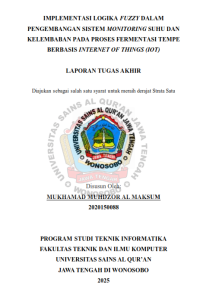 XMLFermentasi merupakan salah satu tahapan dalam proses pembuatan tempe yang membutuhkan suhu dan kelembaban yang stabil agar menghasilkan produk berkualitas dan konsisten. Namun, proses fermentasi yang dilakukan masih menggunakan cara manual yang mengandalkan intuisi dan pengalaman, sehingga sulit menjaga hasil produksi, terutama di daerah dengan suhu yang rendah dan kelembaban tinggi seperti Kabupaten Wonosobo. Penelitian ini bertujuan untuk mengembangkan sistem monitoring suhu dan kelembaban berbasis Internet ofThings (IoT) dengan penerapan logika fuzzy guna mendukung proses fermentasi tempe secara optimal. Metode yang digunakan dalam penelitian ini adalah Research and Development (R&D) dengan metode pengembangan prototyping, serta penerapan logika fuzzy sebagai metode pengambilan keputusan untuk mengontrol perangkat (kipas, heater, dan mistmaker) berdasarkan data dari sensorDHT22. Data suhu dan kelembaban dikirimkan ke ESP32 diolah menggunakan logika fuzzy dan hasilnya dipantau secara real‑time melalui layar lcd sertaplatform Blynk. Hasil pengujian penelitian ini menunjukkan bahwa sistem dapatmenjaga nilai suhu dan kelembaban sesuai dengan standar fermentasi tempe (30–36 °C dan 60–70% RH). Implementasi sistem monitoring suhu dan kelembaban pada proses fermentasi tempe dengan menggunakan metode logika fuzzy berhasil mempercepat waktu fermentasi tempe sekitar 17 jam.Kata Kunci : Internet of Things (IoT), Logika Fuzzy, Fermentasi Tempe, SistemMonitoring Suhu dan Kelembaban.