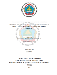 XMLPinasti, Adilla. 2022260024. 2025. The Effectiveness of CommunicativeLanguage Teaching (CLT) Method to Improve Students’ SpeakingAbility for Eleven Grades of SMK Wiratama 45.2 Wonosobo.This study aims to determine the effectiveness of CommunicativeLanguage Teaching (CLT) method in teaching learning process and Englishspeaking ability about “introduce my self” for eleven grades of SMK Wiratama45.2 Wonosobo. This research usea experimental design with a population of alleleventh grades students of SMK Wiratama 45.2 Wonosobo, namely XI TKR, XI TKJ and XI APH. The samples of this study are XI TKR 2 and XI TKR 3. Thisresearch used pre-test and post-test to collect data. The results show that use ofCLT method is effective to improve speaking ability. In experimental class, theaverage pre-test score was 52 and the average post-test score was 76. While incontrol class, the average pre-test score was 58 and the average post-test scorewas 68. Based on the resukts of the analysis, it can be concluded that the use ofCLT method is effective to improve students’ speaking ability for eleven grades inSMK Wiratama 45.2 Wonosobo. The implementation of the use ofCommunicative Language Teaching can be seen from the enthusiasm of studentsin applying this method on the Communicative Language Teaching is quite good. Thiscan be inferred from the final results of the average post-test experimentalclass. to determine the significant differences between students who are taught byusing Communicative Language Teaching method and those who are taughtwithout using Communicative Language Teaching method
