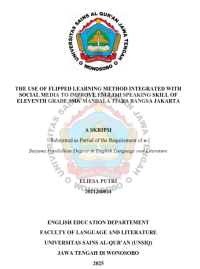 XMLEliesa Putri. (2021260024). The Use of Flipped Learning MethodIntegrated with SocialMedia to Improve Student Speaking Skill of SMKMandala Tiara Bangsa, Jakarta A Skripsi. Faculty of Language andLiterature. University of Sains Al-Qur’an.This classroom action research aims to investigate the implementation of theflipped learning method integrated with social media to improve the englishspeaking skills of eleventh-grade students at SMK Mandala Tiara BangsaJakarta. The research was conducted in two cycles, each consisting ofplanning, acting, observing, and reflecting stages. Data were collected throughobservations, speaking tests, questionnaires, and interviews. The findingsreveal that the integration of social media platforms such as TikTok andYouTube into flipped learning significantly enhanced students’ engagement, confidence, and overall speaking performance. The average speaking scoresincreased from 13.1 in the pre-cycle to 15.0 in Cycle 1, and 18.2 in Cycle 2. Improve ments were observed in various aspects including pronunciation, fluency, vocabulary, and idea development. Additionally, students expressedpositive attitudes toward learning through digital content outside theclassroom. These results indicate that the flipped learning method supportedby social media is an effective strategy to develop speaking skills in avocational high school context.