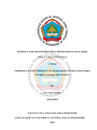 XMLThis study aims to analyze: (1) how traumatic experiences become the trigger forCheryl Strayed’s journey in the Wild (2014) movie, and (2) how her process of self transformation is portrayed throughoutthe film, basedonAbrahamMaslow’shierarchyofhumanneeds.This research uses a descriptive qualitative method, with Wild (2014) as the mainobject of analysis. Data ked collected through watching the film, reading the dialogues, identifying, classifying, and interpreting relevant scenes and conversations. The researcherapplies Abraham Maslow’s theory to explore how Cheryl’s psychological developmentprogresses from fulfilling basic needs up to achieving self-actualization.The results of the study show that: (1) Cheryl’s traumatic experiences such as thedeath of her mother, childhood abuse, addiction, and the failure of her marriage serve asthe emotional catalyst for her solo hike along the Pacific Crest Trail; (2) through the stagesof Maslow’s hierarchy, Cheryl gradually fulfills her physiological and safety needs,progresses to seek love and belonging, develops self-esteem, and ultimately reaches a stateof self-actualization. Her transformation is portrayed through moments of emotionalstruggle, spiritual reflection, and personal growth, culminating in a rediscovery of heridentity and inner peace. This research concludes that Wild is not merely a depiction ofphysical struggle and endurance, but also a depiction of deep emotional healing andpsychological transformation driven by past trauma and guided by a search for meaning.