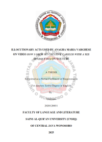 XMLThis research aims to analyze: 1) types of illocutionary acts and (2) the function of types of functions of illocutionary acts spoken by AnaghaMaria Varghese on video “How I Grew My Creative CarieerWith A YesMindset (2024) on YouTube.The method used in this study is a qualitativeresearch method toanalyze video of I Grew My Creative Carieer WithA Yes Mindset OnYoutube (2024) by Anagha Maria Varghese as the object research. The datacollection methods include watching, identifying, classifying, and selecting.The researcher utilizes John R.Searle’s theory to analyze the data throughsteps of displaying, explaining, and interpreting.The result of this research shows that: 1) types of illocutionary acts onvideo “How I Grew My Creative Carieer With A Yes Mindset (2024) onYouTube.including types of illocutionary acts on video which spoken byAnagha Maria Varghese in this study, those are declarative, assertive,exspressive, commisive, directive 2) the functions of types of illocutionaryacts accprding to Anagha Maria Varghese, those are Asserting, ExpressingFellings, Commanding, Aggrement.